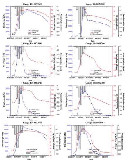 The precipitation distribution is reflected in the observed gauge heights in the area. Variations in gauge heights, rainfall, and discharge were observed in the different USGS gauges that are distributed throughout the Houston area, which are shown in Figure 3, during the passage of Hurricane Harvey. The horizontal axis indicates dates from 23 August to 10 September 2017. The gauge heights and discharge reach the highest level on 27–28 August. In all the gauges, there is a short lag-time, and the peak discharge and gauge height are reached after the rainfall begins and reaches its maximum on 27 August. There are missing data for one gauge (Gauge ID: 8074810), but all the gauges are showing similar timing of floodwater peak or discharge. The gauge height drops immediately after the cessation of rainfall on 29 September 2017. The maximum height is reached suddenly on August 27 or 28 due to highest rainfall on 27 September, and again it drops almost immediately after the cessation of rainfall.