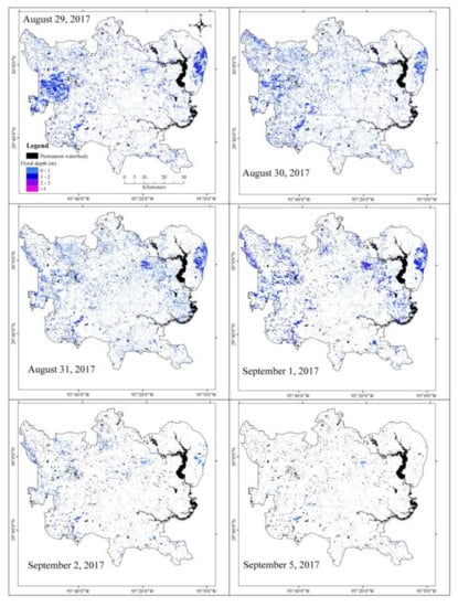 The flood extent due to Hurricane Harvey is from 29 August to 5 September 2017 is illustrated in Figure 4. As observed from the August 29 and 30 images, these were peak flood days, while 5 September showed the least amount of flooding. The extent of the flooded area for 29 August was patchy, but the most continuous flooding occurred over western Houston, which includes urban and rural areas. The 30 August 2017 map shows a 1.22% increase in flood extent, indicating the maximum area affected by flood. However, a decrease in precipitation after 29 August 2017 resulted in a gradual decrease in the water levels. The precipitation stopped after 29 August 2017. Therefore, recession of water was observed on 31 August as a decline in water extent and retreat from the city center, although water was retained in the outskirts of Houston in the rural areas. The floodwaters receded after 24–48 h in most of the areas, but a few areas showed elevated water levels for several days after the hurricane (Figure 4). The decrease in the flood extent on 1 September was greater than that of the extent from 31 August 2017 and continued to decline through September 2 and 5. The total flooded area with a peak flooded area of 12.92% on 30 August 2017 gradually reduced to 11.09% on 31 August 2017, 10% on 1 September 2017, and 3.82% and 1.30% on 2 and 5 September 2017, respectively, in both Sentinel-1 and UAVSAR images (Table 2).