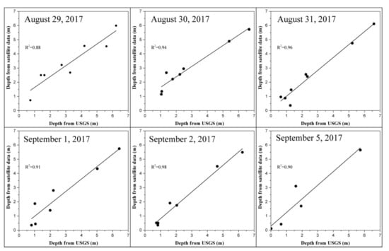 The depths obtained from LiDAR DEM by the process of differencing water surface elevation and land surface elevation (i.e., DEM) were compared with the observed depth from USGS gauges (Figure 6), and kappa statistics and the overall accuracy of this method were estimated for flooded points between USGS data and the flood extent (Table 3). The Pearson correlation (R2) for all dates for gauges with positive values or floodwater was greater than 0.88. The kappa statistic ranged from 0.90 to 1, and the overall accuracy was 96% to 100% for these gauge stations. This method of flood depth estimation was essential (especially during flooding when gauges may be under water or in areas with little or no insitu observations) since it involved the use of the extent and the DEM [], hence, the depth estimation at all available dates during the passage of the hurricane.