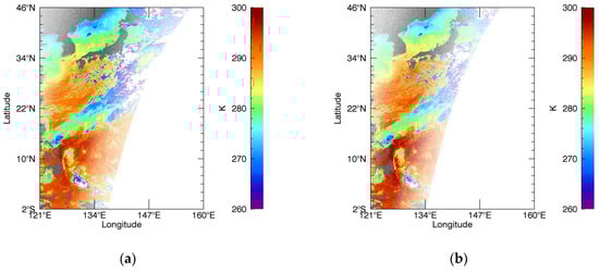 Sea Surface Temperature (SST) is one of the critical indicators that characterizes changes in the marine environment and climate. Many ocean dynamic processes are related to SST; thus, SST has been widely used in ocean dynamics research and air–sea interactions, such as studying El Niño and La Niña phenomena and the analysis of Kuroshio and Gulf Streams [1,2]. SST is an important indicator of climate change and has been applied to climate change monitoring [2]. SST has also been used for weather forecast [3], marine fishery monitoring [4], etc. Most satellite SST data are required for an accuracy of about 0.5 °C when applied at high spatial resolution (0.5~10 km) [5]. The SST data used to study climate change requires higher accuracy of about 0.1 °C [6].