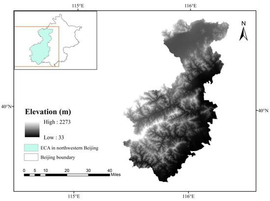 The ECA study area (115°24′57″ E–116°20′42″ E, 39°30′20″ N–40°37′44″ N) is located in western Beijing (Figure 1). It is located between the North China Plain and the Mongolian Plateau, and plays a transitional role between the two terrains, covering an area of approximately 11,140 km2 [33]. The study area is mostly covered by mountains, with the lowest elevation of 33 m and the highest elevation of 2273 m. The area belongs to the mid-latitude continental monsoon climate; the average annual temperature range is between 8–19 °C, and the average annual rainfall is about 555 mm. The region is rich in water resources and is of great significance in regulating water flow, improving water quality and protecting the natural environment of the capital. In the past 20 years, with the rapid economic development and population growth of the capital, the land use of the ECA in western Beijing has been through great changes, including the accelerating process of urbanization, increasing construction land, decreasing cultivated land and grassland and the reduction of ecological function.