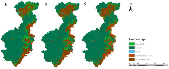 The random forest parameters in the LEAS module were set as follows: uniform sampling method was used, the number of decision trees was 20, the sampling rate was 0.01 and the number of features used to training random forests was eight, which was the same as the number of driving factors. The constraint map is a binary image in which 1 represents that this land-use type can convert to other land-use types, and 0 represents that this land-use type cannot convert to other land-use types. In the constraint map in this research, we set that water and construction land cannot convert to other land-use types and that grassland, forest and cultivated land can convert to other land-use types. The land-use transfer matrix is detailed in Table 2, and the neighborhood weights for land-use types are detailed in Table 3. Table 2 and Table 3 are set according to the article of Liang et al. [22] and the situation of the study area.