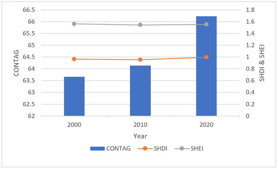The change of SHDI, SHEI and CONTAG in the ECA of western Beijing during 2000–2020.