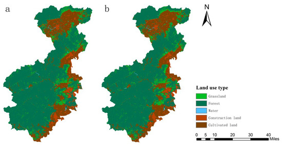 Land-use simulation maps of: (a) PLUS model; (b) FLUS model in the ECA of western Beijing in 2020.