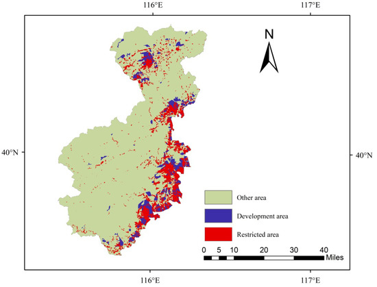The PLUS model was used to predict the land-use status of the ECA in western Beijing in 2030 under two scenarios. Firstly, the natural development scenario and, secondly, including the influence of planning policy (Figure 6). In the first scenario of natural development, land change was not affected by other external factors and was only related to the characteristics of historical land change. Natural and geographical factors and economic and social conditions were consistent with the current situation, that is, setting the same pattern and speed of land-use change in 2020–2030 as in 2010–2020. In the second scenario, the planning policy mainly refers to the regional planning. Regional planning not only focuses on large-scale planning policies, which explicitly prohibit some construction areas, but also delineates areas that encourage development, such as the planning of development zones [38]. For our study, the planning development zone of the study area was taken as the planning policy. The data of the planning development zone comes from the General Plan of Beijing (2016–2035) issued by the Beijing Municipal People’s Government in 2017 [39] (Figure 7). Supported by ArcGIS 10.2, we made a restricted development zone and development zone map and added this to the PLUS (v1.3.5) CARS module, so that policy intensity had the development weight of 0.5 for development type 4 (construction land).