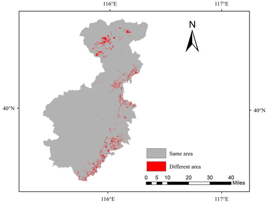 The inconsistent areas predicted under the two scenarios can be seen in the diversity map (Figure 8). Compared with Figure 6 and Figure 7 and Table 11 and Table 12, it can be found that the inconsistent areas are mostly construction and cultivated land. There was 10 hm2 cultivated land converted to construction land under the natural development scenarios, which were converted to grassland and water under the influence of the regional planning policy. Compared with the natural scenario, in the regional planning policy impact scenario, the development area had more construction land. However, in the restricted area, the construction land was reduced. This demonstrates that the government’s planning policy can play a key role in the future land-use change.
