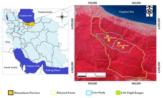 The study area is located within the Kheyrud Experimental Forest, with a total area of approximately 20 km2. The area spreads across both Namkhane (Latitude 36°54′43″ to 36°57′72″N; Longitude 51°56′85″ to 51°63′40″E; WGS84—Universal Mercator projection; elevation in the district ranges from 0 to 1350 m above sea level) and Gorazbon (Latitude 36°53′48″ to 36°56’36”N; Longitude 51°60’72” to 51°66’51”E; WGS84; elevation in the district ranges from 554 to 1489 m above sea level) districts within Mazandaran Province, Northern Iran (Figure 1), also known as the Hyrcanian region. Hyrcanian mixed temperate forests form a unique forested massif that stretches for 850 km along the southern coast of the Caspian Sea and covers over 19,000 km2 [,]. These forests were designated as a UNESCO World Heritage Site in 2019 []. Annual precipitation fluctuates between 1300 and 1600 mm, with minimal rainfall occurring mid-summer []. In the study region, dominant tree species include common hornbeam (Carpinus betulus), oriental beech (Fagus orientalis), chestnut-leaved oak (Quercus castaneifolia), Caucasian alder (Alnus subcordata), velvet maple (Acer velutinum), and Persian ironwood (Parrotia persica) [].