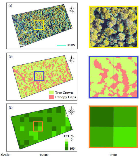 The reference FCC maps were developed based on high-resolution UAV orthophotos and DSMs extracted from UAV images. To enable an object-based image analysis (OBIA), the tree crown borders were delineated using the eCognition Developer software (Ver. 8.7) []. To segment the image into homogeneous objects and determine tree crown borders, image segmentation following the multiresolution segmentation (MRS) method was carried out using the UAV-obtained multispectral RGB orthophotos and the DSM (Figure 2a). The MRS parameters were optimized by applying a trial-and-error approach. Segmented images were then classified as either tree crowns or canopy gaps using the nearest neighbor classification (NNC) technique (Figure 2b). The canopy gap class included understory vegetation, bare land, and forest roads. A grid with 50 × 50 m cell size was placed over the maps to determine FCC, and cells belonging to each class were counted. FCC diversity and individual tree crown attributes (such as crown perimeter) are the most important factors that can effectively determine the grid’s cell size. In uneven, mature, dense, and heterogeneous forests (such as our study area), most individuals have large and wide crowns and small gaps between the canopies. Therefore, it is impossible to use a small grid cell size to measure the FCC percentage reliably. We selected the grid cell size by testing different values (10 to 50 m). Finally, the FCC was calculated based on Equation (1)