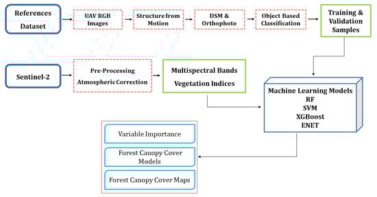 This study applied four ML models to map and predict FCC based on UAV training samples and Sentinel-2 satellite imagery. These models were then used for further model training, identification of the most important predictor variables, and canopy cover estimation. The workflow of the study is shown in Figure 3.