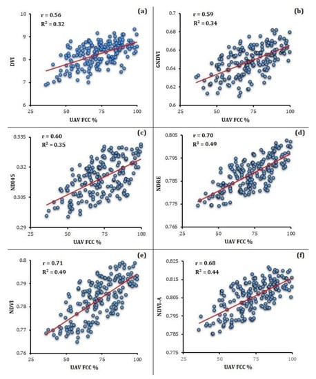 Linear relationships between UAV-based forest canopy cover percentage (FCC%) and vegetation indices: (a) DVI = difference vegetation index; (b) GNDVI = green normalized difference vegetation index; (c) NDI45 = normalized difference index 4 and 5 red edge; (d) NDRE = normalized difference red-edge index; (e) NDVI = normalized difference vegetation index; (f) NDVI-A = normalized difference vegetation index based on B8 A.