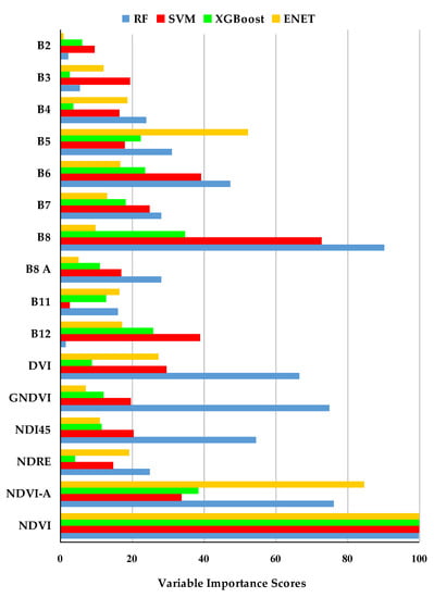 The scores of the variable importance estimation are provided in Figure 5. Generally, the importance of variables for all of the used models (RF, SVM, XGBoost, and ENET) was similar, with NDVI, NDVI-A, NDRE, NDI45, and B8 (Sentinel-2 band 8) being the most important variables, followed by B6, B5, B12, DVI, and GNDVI (Figure 5).