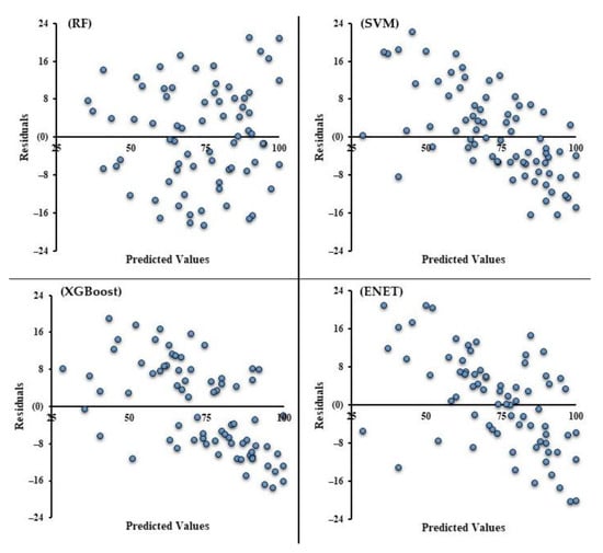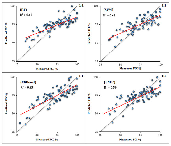 Residuals predicted by the ML models are shown in Figure 7. Based on the results, the residuals estimated by RF were found in a smaller range compared to those of other ML models. Additionally, the residual scatterplot of the RF model showed a rather random pattern, indicating that the RF model provided a decent fit to the data. The residuals predicted by the SVM, XGBoost, and ENET ML models showed similar distributions. According to the analysis of the residual scatterplots, there was an apparent overestimation of low FCC and an underestimation of high FCC, as returned by the SVM, XGBoost, and ENET ML models.