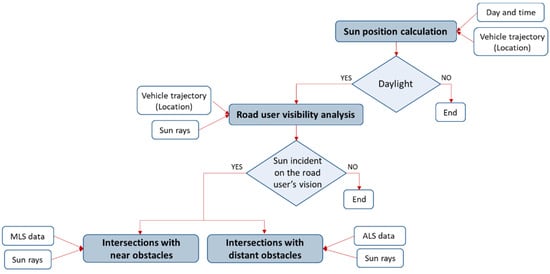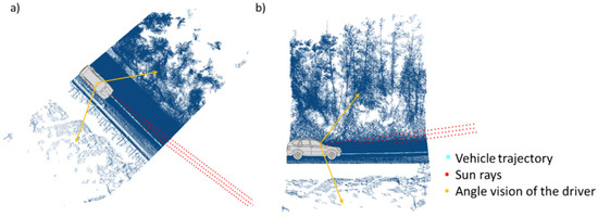 26] proposed a method to obtain solar radiation and solar envelopes based on information from point cloud data in the built environment. Regarding the previous approaches, in this work, the Sun’s position is defined with the solar altitude α and the azimuth angle β at a given geographical location, day, and time. Considering together the Sun’s position, driver’s location, and diver’s bearing (road slope and road bearing), the incidence of sunlight within the driver’s vision angle is calculated. Moreover, the sunlight trajectory and sun rays relative to a point of study are obtained, therefore, it is possible to analyze whether sun rays intersect with any near (MLS data) or distant obstacle (ALS data) before reaching the point of the road user.