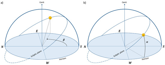 The Sun’s position during summer solstice: (a) azimuth angle β and (b) solar altitude α.