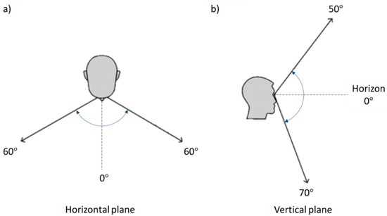 Figure 3. Regarding the horizontal plane, the human vision field range is between 60° and −60°, while on a vertical plane, the human vision field is between 50° and −70°, [