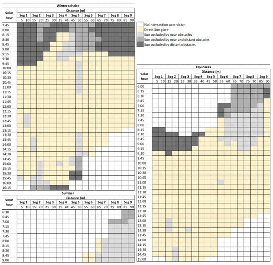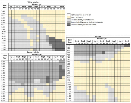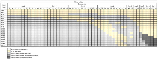 24] analyzed sun glare regions using visual explanations for traffic light detection and considering the vehicle orientation. Although the driver’s bearing and intersections with obstacles were analyzed, neither of them studied near and distant obstacles in detail that can occlude sunlight.