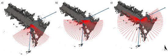 Similar to the MLS point cloud processing, in the subsequent stage, ALS point cloud is analyzed whether or not sun rays intersect with any distant obstacles and the driver’s vision. The maximum distance to be considered with respect to the study road is examined. An approach is proposed where the distance of the furthest obstacle that the user can see is chosen. The workflow related to this processing is shown in