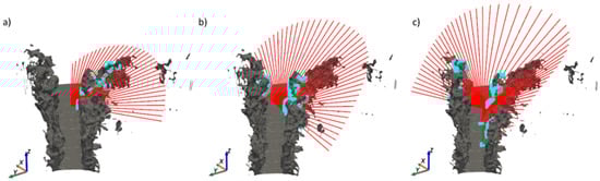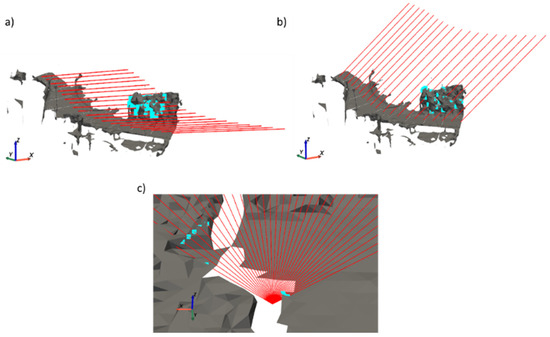 Intersections (blue points) with obstacles: (a) intersections with near obstacles at 9:00 solar hour in winter solstice, (b) intersections with near obstacles at 9:00 solar hour in summer solstice, and (c) zoomed view of intersections with distant obstacles at 50 m.