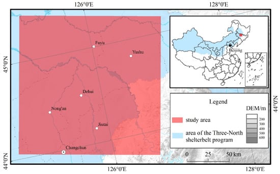 The study area was located in Songnen Plain in the midwestern Jilin Province in north-eastern China (Figure 1). The climate in the area is a temperate, semi-humid, continental climate with annual precipitation of 660 mm and annual average temperature of 5 °C. The study area represents typical areas included in the Three-North Shelterbelt Program, a massive reforestation program with the objective to reduce the infestation of sandstorms in northern China. This area is also one of the main grain-producing regions in China and is known as one of the three most renowned corn belts in the world. Farmland shelterbelt construction started in the 1950s and was well established in the study area; the shelterbelt has been providing important protection against wind erosion to secure the stable production of grain crops []. However, the construction of the shelterbelt was undertaken by local people at different time periods, largely without consistent planning based on scientific data. As such, the early shelterbelt forests offered only limited protection against wind erosion. Following the implementation of the Three-North Shelterbelt Program in 1978, regional farmland shelterbelt construction underwent rapid development, and now networks of farmland shelterbelts have dramatically reduced sandstorm severity and frequency. Currently, the farmland shelterbelt established over the last 30 years is undergoing a stage of renewal and improvement.