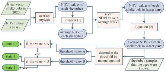 NDVI was used to divide the states of the shelterbelts in each single image. It was calculated by the TOA reflectance values of the red and near-infrared bands of each image. As shown in Figure 2, the dividing method consisted of three steps.