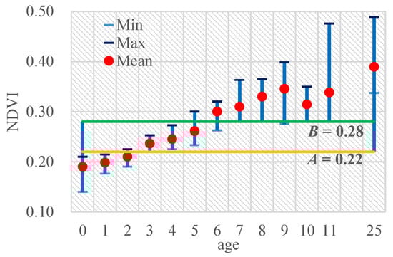 Thresholds A and B were manually determined by investigating the NDVI values of shelterbelts, for which the year of planting was known. Using the image from 28 May 2020, an example is as follows. The NDVI values (max, min, and mean) of the intact parts of the shelterbelts of different ages are shown in Figure 3. It showed that the spectral characteristics of the farmland shelterbelts were similar when the shelterbelt age was >6 years. The values for shelterbelts that were 1–2 years old were close to those of bare soil (age = 0), but the difference between 1–2 years old and >2 years old was evident. The NDVI of shelterbelts that were 3–4 years old and those that were >6 years old were even more evident. Therefore, 0.22 was selected as the threshold A in 2020, and 0.28 was selected as the threshold B.