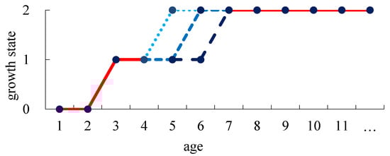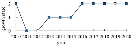 Based on the three states of farmland shelterbelts that were determined from a single remote sensing image, the growth process of the shelterbelt shown in Figure 4 are expressed in Figure 5. According to remote sensing monitoring, shelterbelt growth attains each state (i.e., states 0, 1, and 2) successively. The duration of a shelterbelt in state 0 and state 1 was 2 and 3 years, respectively. A shelterbelt in state 2 was considered to commence from the sixth year after planting.