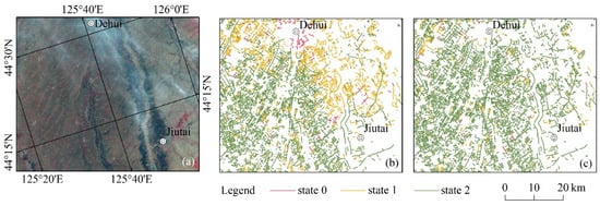 The three-stage growth process of farmland shelterbelts determined from time series remote sensing images represented an ideal status. In practical application, it may be affected by other factors, especially cloud cover, which may cause deviations in the simulation of the shelterbelt growth process. If clouds were present, shelterbelts in state 1 could be misclassified as 0, or shelterbelts in state 2 could be misclassified as 0 or 1. According to the three-stage growth process in Figure 6, the following rules were developed to improve prediction accuracy: