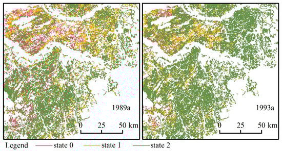 In addition, the shelterbelt states in 1989 and 1993 were not determined as there were no suitable remote sensing images available. The states of some shelterbelts in 1989 and 1993 were predicted using the rule in Table 2. The shelterbelt states in 1989 were predicted from their states in 1987 and 1991, and the shelterbelt states in 1993 were predicted from their states in 1991 and 1995. The predicted results are shown in Figure 8.