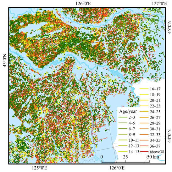 Based on the modification and prediction results of the shelterbelt states in each monitoring year, the shelterbelt ages in 2020 were identified using the algorithm. The result is presented in Figure 9. Given the two-year monitoring period, the monitoring error was 1 year. The minimum age that could be monitored was 2–3 years, and the maximum age was 36–37 years; ages that exceeded 37 could not be identified as no suitable images were available.
