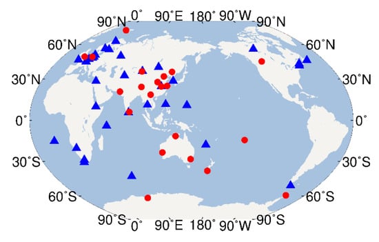 Figure 2. Distribution of GNSS tracking stations used for the BeiDou-3 IGSO POD. Red circles are iGMAS stations, and blue triangles represent MGEX stations.