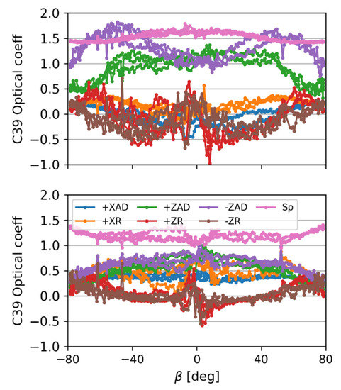 In this section, the adjusted optical parameters of BeiDou-3 IGSOs are discussed. Satellite C39 is selected as an example for BeiDou-3 IGSOs. Figure 3 illustrates the estimated optical coefficients for satellite C39 without and with considering communication payloads as a function of β -angle. To make the presentation of Figure 3 more concise, the absorption plus diffuse reflection ( α + δ ) , as well as the specular reflection ( ρ ) parameters, are denoted by the words “AD” and “R”, respectively. It can be clearly seen that the stability of optical parameters is improved significantly when the contribution of communication payloads on ± X surfaces to SRP perturbations is taken into account. This is closer to the fact that the satellite optical properties do not change from day to day. In the study, the adjusted optical coefficients for satellite bus with communication payloads are involved in the a priori box-wing model (Equation (3)) to enhance the ECOM1 model. The optical coefficient estimates for solar panels are not used because the contribution of solar panels can be well covered through the D 0 term of empirical SRP models. Table 3 gives the adjusted box-wing optical coefficients for the BeiDou-3 IGSOs’ satellite bus, which are acquired by averaging the daily corresponding estimates for all BeiDou-3 IGSOs during the experiment period.