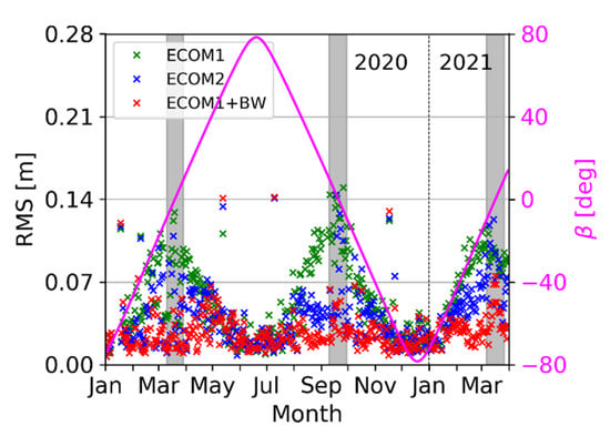 A significant part of the systematic β -dependent pattern in the clock fitting residual RMS for the ECOM1 solution is induced by radial orbit modeling defects, which can be confirmed by the clock residual time series on DOY 172–173, 2020 ( β 78.4 ° ) and DOY 254–255, 2020 ( β 9.5 ° ) presented in Figure 5. During DOY 254–255 of the year 2020, there is a once-per-revolution signal with an amplitude of roughly 20 cm in the clock fitting residuals, resulting in a large clock residual RMS. The major reason is that the ECOM1 model cannot fully consider the effect of the rapidly varying cross-section exposed to the Sun on SRP during periods with small β -angles, which introduces systematic once-per-revolution radial orbit errors [9]. This systematic error can be reduced by using the ECOM2 model or almost eliminated when using the developed a priori box-wing model, as shown in Figure 5. For the periods with a large β -angle on DOY 172–173 of the year 2020, the illuminated cross-section of the satellite body does not change much. The ECOM1 model can work as efficiently as the ECOM2 and ECOM1 + BW models in this scenario (Figure 5, top). The SRP modeling defects of the ECOM1 model leads to this systematic β -dependent pattern in the clock fitting residual RMS.