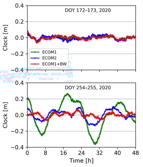 Figure 5. Satellite C39 clock fitting residuals for the ECOM1 (green), ECOM2 (blue) and ECOM1 + BW (red) solutions on DOY 172–173, 2020 (top), β 78.4 ° ) and DOY 254–255, 2020 (bottom), β 9.5 ° ).