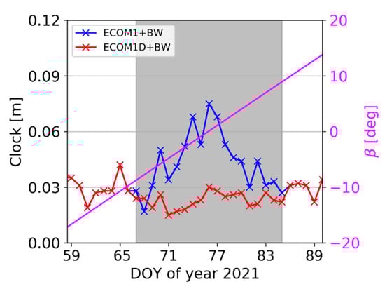 In order to illustrate the clock behaviors of eclipsing BeiDou-3 IGSOs in detail, Figure 6 gives the time series of clock fitting residual RMS for satellite C39 based on the ECOM1 + BW model during one eclipse season (days 58–90 of the year 2021). With the decrease of β , the clock residual RMS is significantly elevated. This clearly indicates the presence of orbit modeling deficiencies during eclipse seasons.