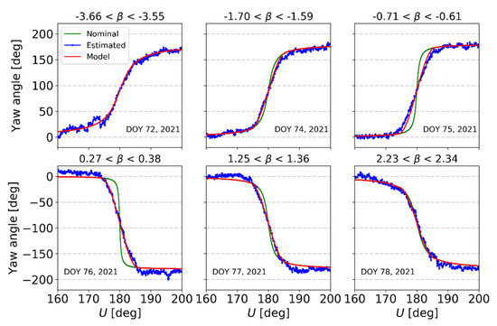 From Figure 7 and Figure 8, the yaw maneuvers of BeiDou-3 IGSOs occur when the β -angle is in the range of [ 3 ° , 3 ° ] and the U angle is in the range of approximately [ 6 ° , 6 ° ] or [ 174 ° , 186 ° ] . The yaw behaviors of eclipsing BeiDou-3 IGSOs can be well reproduced by the BeiDou continuous yaw-attitude model used in this study [13,33]. This rules out the first assumption that attitude errors may be the reason for the orbit deterioration and suggests the presence of unmodeled non-conservative orbit perturbations during eclipse seasons.