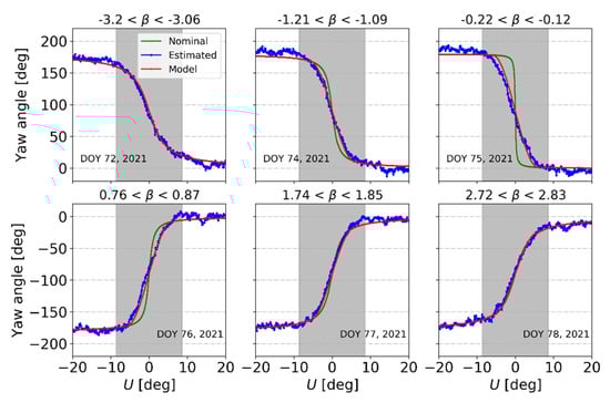 Figure 8. Nominal (green), estimated (blue) and modeled (red) yaw angles of IGSO C39 passing the Earth’s shadow (gray area) under different β -angles.