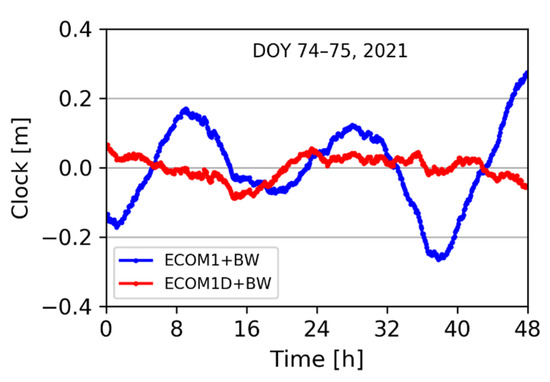 Figure 9. Satellite C39 clock fitting residuals for the ECOM1 + BW (blue) and ECOM1D + BW (red) solutions on DOY 74–75, 2021 ( β 1.8 ° ) .