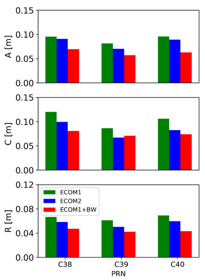 Figure 10. Mean orbit DBDs ( Δ R , Δ A , Δ C ) s for the ECOM1, ECOM2 and ECOM1 + BW solutions of BeiDou-3 IGSOs in along-track (A), cross-track (C), and radial (R) directions outside eclipse seasons.