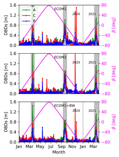 Figure 11. Orbit DBD time series ( Δ R , Δ A , Δ C ) s for the ECOM1, ECOM2 and ECOM1 + BW solutions of BeiDou-3 IGSO C39 in along-track (A), cross-track (C) and radial directions.