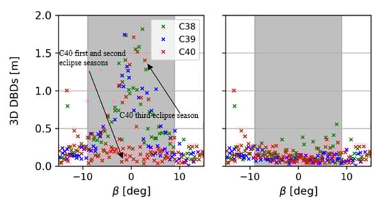 Figure 12. Orbit 3D DBDs of BeiDou-3 IGSOs for the ECOM1 + BW (left) and ECOM1D + BW (right) solutions against β -angle. The area shaded in gray indicates eclipse seasons.