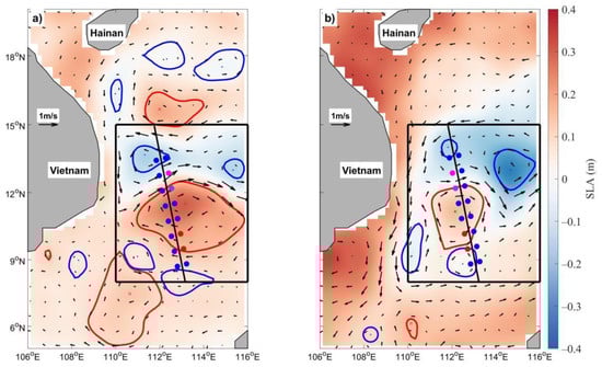 The current system and eddies in the SCS. The dots and black lines show CFOSAT-SWIM wave and wind track on (a) 8 October 2019, and (b) 16 November 2019. The shading color in the panels represent sea level anomaly (SLA). The black arrow represents AVISO geostrophic current anomaly. Red and blue lines demarcate warm- and cold-core eddies identified by the automatic eddy detection algorithm. In this study, attention is placed on the warm-core eddy in the black box (Section 4).