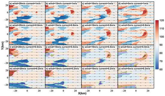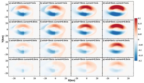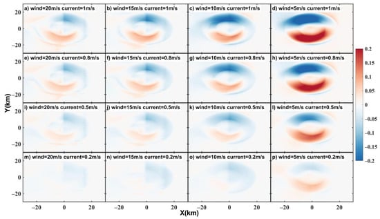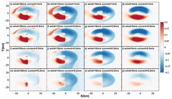 Surface currents induce strong variability in , and this is especially significant in highly solenoidal current fields such as those found in eddies []. Results for changes in under the sixteen cases (Table 1) are presented in Figure 3. Model runs without currents added are also given for ease of comparison. Shadings given relative differences are estimated as the subtraction of modeled results without currents from those with currents. Relative differences are the ratios of the differences to the results without current. The most readily observable characteristic was the asymmetrical distribution of wave variability (Figure 3a–d). A dipole-like structure formed where in the upper region demarcated by Y = 50–70 km decreased but was accompanied by a simultaneous increase in the lower region (Y = 30–50 km). This occurred because the angle between waves and currents (WCA) was less than 90° in the upper region, but larger than 90° in the lower region. This resulted in waves following the current (upper region) but opposing the current (lower region). CEW became more apparent as current velocities increased (Figure 3d,h,l,p). Interestingly, when the wind speed decreased (Figure 3a–d), CEW also became strong. This was due to the ratio of wave group velocity to the current velocity. The closer the ratio was to 1, the stronger the CEW and vice versa. Generally, the wave group velocity was much larger than the current velocity. When wind speeds were low, and wave heights were small; the closer the wave and current velocities were to one another, the stronger the CEWs (Table 1, column 7). In column 6 of Table 1, and Figure 3a–d, it can be seen that the higher the wave age (and hence, the more mature the wave age), the stronger CEW was. In Case 4 when W was 5 m/s and U was 1 m/s, CEW reached its maximum value of 20%. It can also be observed in Figure 3c,d,h,l that increased in the outer age of the upper area where CEW values were negative (X = 50–70 km, Y = 50–70 km). decreased in the lower area (X = 50–70 km, Y = 30–50 km). This result is consistent with Marechal et al.’s [] result.