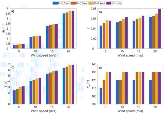 Wave parameters (a) , (b) , (c) , and (d) for the 16 cases in Table 1. The horizontal coordinates represent the different wind speeds (5, 10, 15, and 20 m/s).