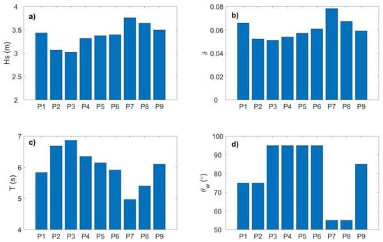 In order to show the CEW to wave distribution more intuitively, the wave parameters of each point under Case 16 (Figure 2; P1–P9) are drawn in Figure 8. It can be seen that from P1 to P9, the wave height and average wave steepness reached the minimum at P3 (corresponding to the upper part of Figure 3a and Figure 5a) and the maximum at P7 (corresponding to the lower part of Figure 3a and Figure 5a), while the mean wave period changed in reverse. The peak wave direction became larger at P3 and smaller at P7, which corresponds to Figure 6a. The analysis of wave distribution from the perspective of this section can deepen the understanding of wave field variations.