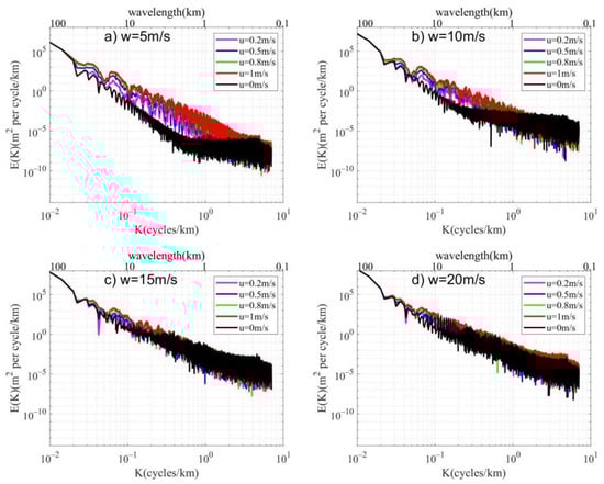 In order to quantify the energy transport from ocean currents to waves, Ardhuin et al. [] used numerical models to simulate waves and currents in the Gulf Stream. There it was identified that the spectra of and U showed that open ocean currents (eddies, fronts, and filaments) could be the main source of the variability in at scales of 10–100 km. To study the energy transport between eddy and waves, spectral analysis was applied to in all cases. The specific steps are described by Wang et al. []. As shown in Figure 9, wave spectra were quite different under different wind fields. When the wind speed was 5 m/s, the wave spectra under different current velocities had large differences, that is, U had a great influence on the wave energy distribution. When the wind speed was 20 m/s, the five spectra under different eddy surface current with 0, 0.2, 0.5, 0.8, and 1 m/s had little difference, which meant that the wave energy distribution was minutely affected by eddies. From Figure 9a, it can be seen that the higher the current velocity, the higher the wave energy. The wave energy simulated with eddy’s maximum current velocity of 1 m/s was highest, followed by the simulation with eddy’s maximum current velocity of 0.8, 0.5, and 0.2 m/s. The minimum wave energy was estimated by the wave field simulated without current. The wave energy distribution caused by the eddy current mostly occurred in the spatial scale of 5–90 km, which belonged to the submesoscale and mesoscale eddies. The last oscillation when k ~ 0.5–8 km−1 was probably related to the numerical dissipation.