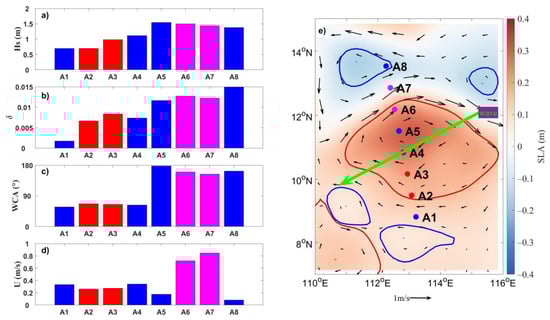 Variation of (a) , (b) , (c) WCA, and (d) U on the CFOSAT-SWIM wave track. Panel (e) is a zoomed black box of Figure 1. The dots in (e) represent the CFOSAT-SWIM wave track on 8 October 2019. The two red dots represent wave and currents propagating/flowing in the same direction. The two magenta dots represent the waves and currents propagating/flowing against one another. The green arrow represents the wave direction of ERA5 data in the area. The shading color, the black arrow, the red and blue lines are the same as in Figure 1.