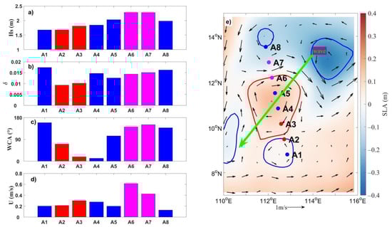 In this section, a large warm eddy located at 9–13°N in the SCS was selected as an example to find the footprint of the mesoscale eddy on wave distribution. Figure 10 and Figure 11 represent the examples on 8 October 2019, and 16 November 2019, respectively. Figure 10e and Figure 11e are the zoomed black boxes of Figure 1a,b. The red line represents a warm-core eddy, which is focused on. The dots A1–A8 are the CFOSAT-SWIM wave track. The , , WCA, and U of these points are plotted in Figure 10a–d and Figure 11a–d. Among them, is the observation data, and is the ratio of the CFOSAT-SWIM-observed to L. Here, WCA is the angle between SWIM wave direction and current direction. The ambiguous CFOSAT-SWIM-observed wave direction was corrected by ERA5 reanalysis. The current velocity used was the AVISO current data interpolated onto the wave track (A1–A8).