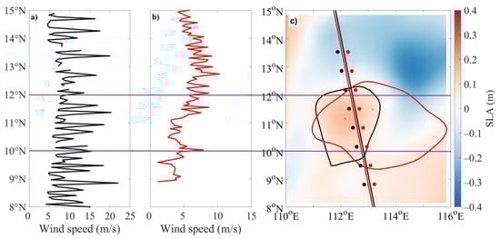 The wind distribution of the CFOSAT-SWIM wind tracks on (a) 16 November 2019, (b) 8 October 2019, and (c) eddy boundaries under current consideration. The shading color represents SLA on 16 November 2019. The red dots and red lines represent the wave and wind tracks on 8 October 2019. The black dots and black lines represent the wave and wind tracks on 16 November 2019.