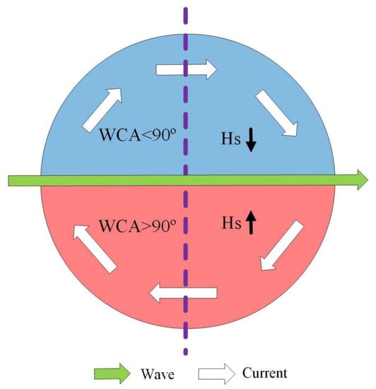 In each experiment, waves propagated west to east with an initial wave direction of 90° (0° is geographical north, rotating clockwise). The refraction induced by the surface currents could be captured by changes . Due to refraction, waves turned within the current fields. In Figure 6, it can be seen that at the upper part (WCA < 90°) of the eddy, the wave direction deflected northward towards the outer edge (i.e., Y = 60–70 km) and the wave direction angle decreased. In the inner area (i.e., Y = 50–60 km), an opposite change occurred. The wave direction was then southward. The different wave direction variation between Y = 60–70 km and Y = 50–60 km caused wave defocusing.