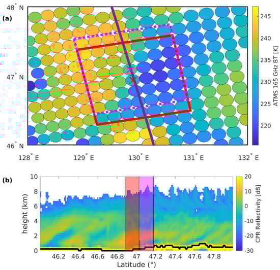 Coincidence dataset schematics. All data represented in the figure are from a snowfall case study occurring over northern China on 11 March 2015 (CPR orbit number 47170). On the top panel (a), the purple line represents the CPR swath, the red and pink boxes are two subsequent 7 × 7 matrices of collocated ATMS BTs, and the ellipses represent ATMS BTs at 165 GHz. The bottom panel (b) shows the corresponding vertical profile of the CPR reflectivity with the two ATMS pixels considered, corresponding to the red and pink “X” in the top panel.